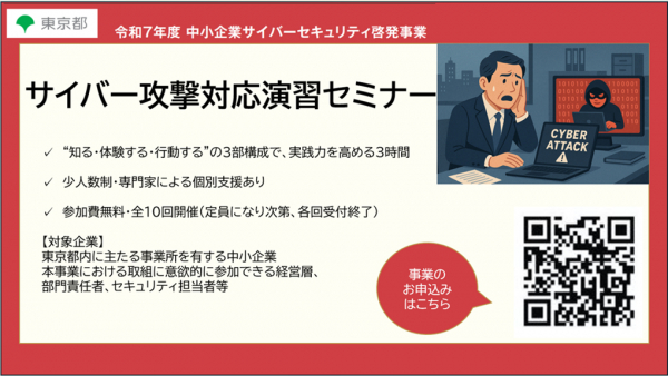 東京都では、令和7年度「中小企業サイバーセキュリティ啓発事業」の一環として、都内中小企業を対象としたサイバー攻撃対応演習セミナーを開催しています。