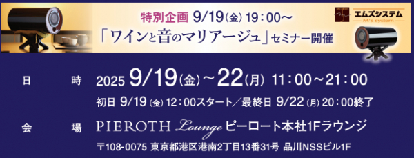 内容:音のエアコンと呼ばれているエムズシステムの波動スピーカーを聞く前と後ではワインの味が美味しく変化してしまう3分間の不思議な体験を楽しんで頂きます。当日はピ―ロート・ジャパン社が大人気ワインを50種以上試飲用でご用意。文字通り、ワインと音のマリアージュを存分にお楽しみいただけます。