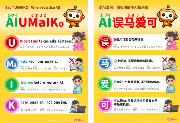 株式会社教育ネット(神奈川県横浜市都筑区 代表:大笹いづみ)は、生成AIを正しく活用するための合言葉「AIうまい子」を掲げたポスターの英語版・中国語版データを追加し、無償提供を開始しました。近年、外国籍の子どもたちの増加やグローバル化に伴い、教育現場でも多言語での情報提供の重要性が高まっています。こうした背景を踏まえ、従来の日本語版とあわせて多言語版を提供することで、より幅広い教育現場や多様な学習者への活用を目指します。また、日本語版「AIうまい子」の紙ポスターの販売もあわせて開始します。