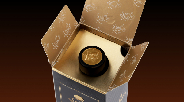 箱を開けると内側には「サンセットリザーブ」のさりげなく敷き詰められ、内側の金色が光に反射して夕陽のように輝きます。