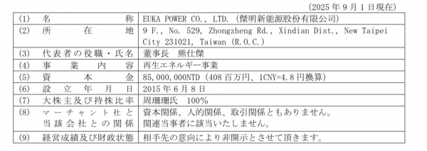 EUKA Power 社は、上海証券取引所に上場するNingbo Techmation Co.,Ltd.(宁波弘讯科技股份有限公司、コード:603015、以下、「弘訊科技社」といいます。)を中心とするTechmation グループの新エネルギー事業専門会社であります。弘訊科技社は、AI やIoT を武器に、各種産業向けの自動生産・生産制御システムに取り組み、時価総額は1,040 億円(1CNY=20.5 円換算)となっております。