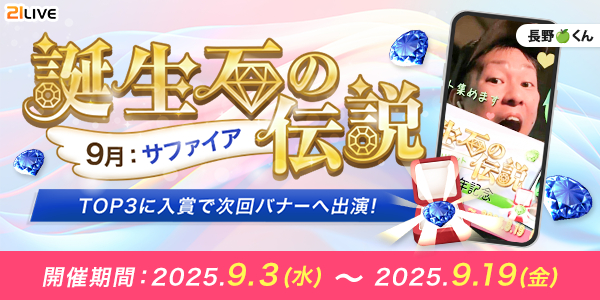 株式会社エムアンドティーティー(本社:沖縄県北谷町、代表取締役:井藤 三知子)が運営するエンターテイメント・ライブ配信アプリ【21LIVE(ニーイチライブ)】URL: https://21.live では、9月3日(水)より『誕生石の伝説』を開催します。
