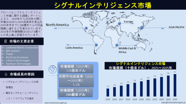 KDマーケットインサイツは、市場分析を発表し、世界の信号情報(SIGINT)市場が2035年までに286億米ドルに達し、2025年から2035年にかけて年平均成長率(CAGR)5.5%で成長すると予測しています。市場の拡大は、信号情報技術の採用の増加とSIGINTソフトウェアの進歩によって促進されています。