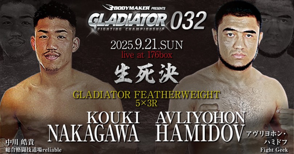2025年9月21日)に「BODYMAKER presents GLADIATOR 032at OSAKA 176box」を開催します。今回もBODYMAKER がメインスポンサーとして大会を全面的にバックアップします。6月8日に行われた「GLADIATOR 031」以来、3カ月ぶりの大会。フェザー級でタイトル挑戦を目指す中川晧貴選手が、ウズベキスタンのアヴリヨホン・ハミドフ選手を迎え撃つ国際戦で再起戦を戦います。王座決定戦、王座決定トーナメントとGLADIATORフェザー級戦線を戦い続けてきた中川選手は、昨年7月にチハヤフル・ヅッキーニョス選手とのどちらが勝っていたもおかしくない接戦で惜敗して以来、実に1年2カ月振りの実戦復帰となります。対するハミドフ選手は、韓国在住のウズベキスタン人ファイターで戦績は12勝7敗。Eagle FC、ONEやRING Championshipでキャリアを積んできました。今回は初来日ながら、韓国でコーカサス&中央アジア軍団を率いるアジスベク・ノロフ選手の推薦を受けて来日が決定しました。世界各国で戦い、フィニッシュ力もあるハミドフ選手に対し、中川選手がその強みである組み技力をいかに発揮できるか。ここで中央アジア越えを果たすと、パン・ジェヒョク選手の持つフェザー級王座挑戦に一気に近づきます。また中川選手のライバルだったチハヤフル・ヅッキーニョス選手はライト級で初勝利後、6月にはモンゴルのMGL-1FCでも一本勝ちを収めGLADIATOR凱旋を果たします。対するBRAVEジム所属の荒井銀二選手は戦績はまだ4戦目ですが、4月の「GLADIATOR 030」での勝利を含め、2度の初回KO勝ちを挙げている新鋭です。一発のある荒井選手との対戦で、打撃に成長の跡を見せ得意の寝技で仕留めることができれば、ヅッキーニョス選手もライト級チャンピオン小森真誉選手への挑戦が見えてくるはずです。今回も白熱の対戦カードの目白押し。また当日は、ボディメーカー製のブランドロゴ入り「オープンフィンガーグローブ」を全選手使用し戦いを繰り広げます。また、会場内では、「コンバットウェア」や、「スポーツウェア」、「トレーニンググッズ」などの人気商品が並ぶ販売ブースを設置します。ボディメーカーの商品を実際に手に取って選べるこの機会に是非とも販売ブースにお立ち寄り下さい。