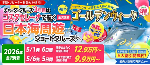 クルーズ予約サイト「ベストワンクルーズ」運営の株式会社ベストワンドットコム(本社:東京都新宿区、代表取締役:澤田秀太、野本洋平)は、2026年ゴールデンウィークにチャーターするコスタセレーナ金沢発着クルーズの早割・リピーター割受付期間を9/30(火)までに再延長いたしました。