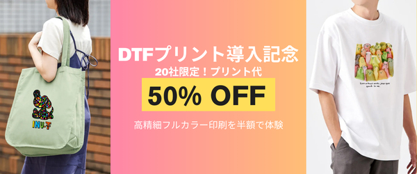今回の「DTFプリント導入記念キャンペーン」では、対象商品50アイテム(Tシャツ/トートバッグ/エコバッグ/ポーチ/巾着/ブランケット/その他:傘・傘袋・コースター)の中から自由にお選びいただけ、プリント料金を通常の半額でご利用いただけます。