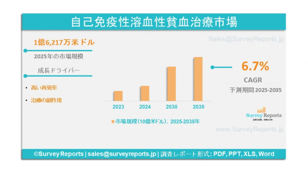 Survey Reports LLCは、2025年9月に研究報告書を発表したと公表した。この報告書は「自己免疫性溶血性貧血(AIHA)治療市場のセグメンテーション:患者タイプ別(成人患者、小児患者)、診断方法別(血液検査、骨髄検査、画像診断)、投与経路別(経口、注射、その他)、疾患タイプ別(温式自己免疫性溶血性貧血(WAIHA)、寒冷凝集素症(CAD)、混合型自己免疫性溶血性貧血、薬剤誘発性自己免疫性溶血性貧血)-世界市場分析、トレンド、機会および予測(2025年~2035年)」であり、AIHA治療市場の予測評価を提供している。報告書は、成長要因、市場機会、課題、脅威など、AIHA治療市場に関するいくつかの主要な市場ダイナミクスを強調している。
