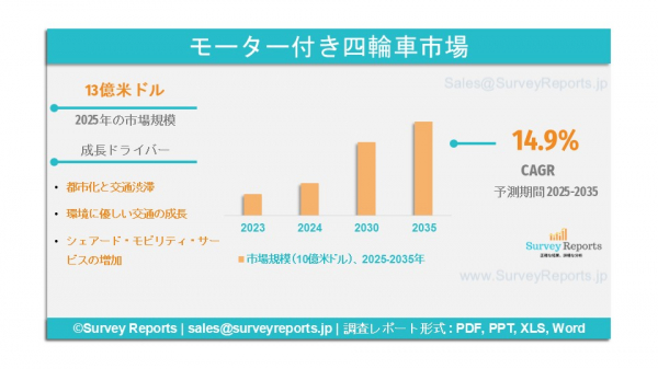 Survey Reports LLCは2025年9月、モータライズド・クワドリサイクル市場に関する調査報告書を発表した。本報告書では、市場を電源別(電動、ガソリン、ディーゼル)、用途別(商用、乗用、レクリエーション)、車両サイズ別(小型、中型、大型)、アプリケーション別(都市型通勤、オフロード、貨物配送)に分類している。さらに本報告書は、モータライズド・クワドリサイクル市場の予測評価を提供し、成長要因、市場機会、課題および脅威といった主要な市場ダイナミクスを強調している。