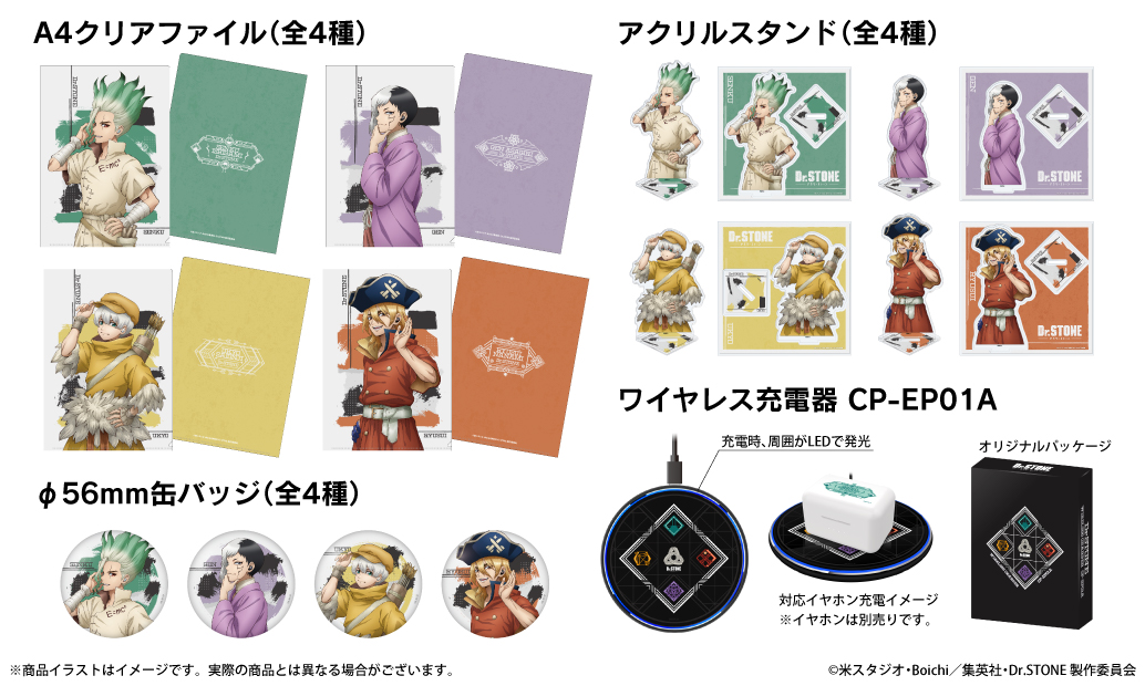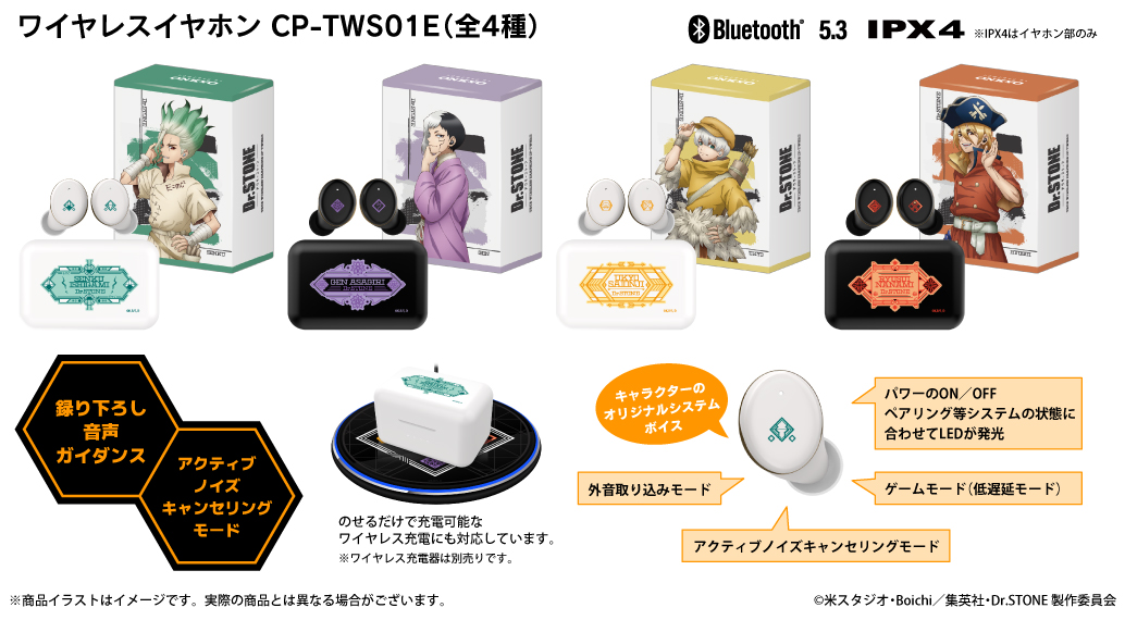 本コラボレーションモデルは、「石神千空」「あさぎりゲン」「西園寺羽京」「七海龍水」の4モデル。充電ケース天面、左右ハウジング共に各キャラクターをイメージしたモチーフやアイコンを配置。電源オンやオフ、ペアリング等、各計13ワードの新規録り下ろしボイスを搭載。パッケージは描き下ろしイラストデザインとなっております。