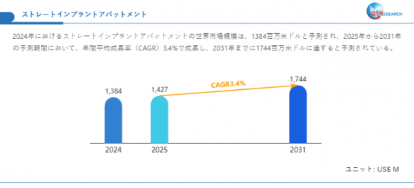 ストレートインプラントアバットメントの世界市場は、2024年に約1384百万米ドルと推定されており、2025年には1427百万米ドルに達する見通しです。今後は、2025年から2031年にかけて年平均成長率(CAGR)3.4%で成長し、2031年には約1744百万米ドル規模に拡大すると予測されています。