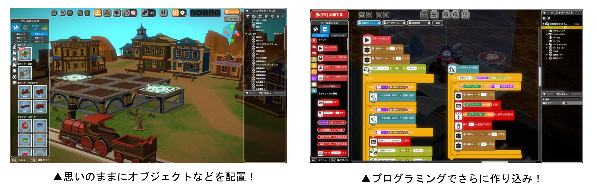 さらに、プログラミングを組み込むことでより細やかな設定を盛り込んだプレイパークを作り込み可能。思い描いたゲーム作りを叶えるだけでなく、遊びを通じて自然とプログラミングの学習にも繋がります。