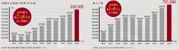 足立区の公示地価は2015年からの10年間で約7万8千円の上昇を記録し、総人口数は10年間で約1万8千人の上昇を記録しました。この継続的な地価上昇と人口増加による、今後の動向に注目が集まります。