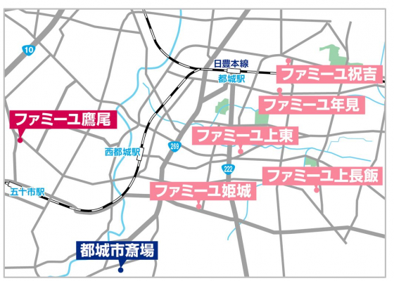 (地図)都城市内のファミーユホールは累計6店舗の展開となる