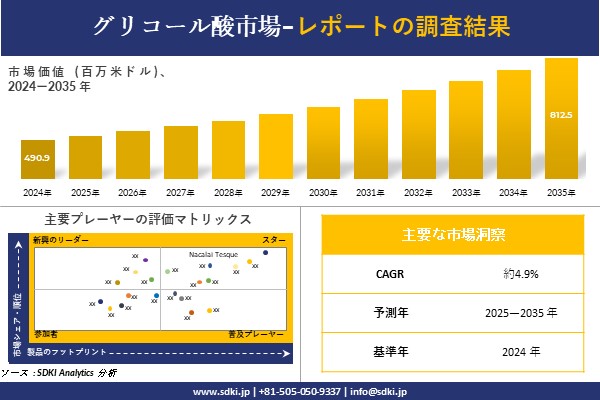 SDKI Analytics(本社:東京都渋谷区)は、このたび、2025年09月04に「グリコール酸市場調査レポート:2025-2035年の市場規模、シェア、傾向の予測」を発表しました。グリコール酸に関する市場調査レポートには、統計的及び分析的アプローチを使用した予測評価が含まれています。この調査レポートでは、一次及び二次調査方法を使用して分析された主要な業界洞察を通じて将来の傾向を理解できるようにすることで、主要な市場動向を読者に説明しています。