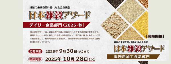 雑穀の普及および、雑穀市場の健全な育成に取り組む一般社団法人日本雑穀協会は、雑穀を活用した食品を評価・表彰する「日本雑穀アワード2025・秋」を開催し、エントリーを受け付けております(締切:9月30日)。併せて、公式サイトを全面リニューアルし、情報提供の充実と利用者の利便性向上を図りました。