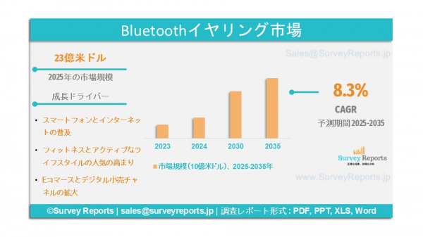 Survey Reports LLCは、2025年9月に『Bluetoothイヤリング市場のセグメンテーション:製品タイプ別(インイヤーBluetoothイヤリング、イヤーカフBluetoothイヤリング、スタッドBluetoothイヤリング、ダングルBluetoothイヤリング)、用途別(スポーツ&フィットネス、ファッション&デザイン)、流通チャネル別(直販/ブランドサイト、Eコマース、オフライン小売)―世界市場分析、動向、機会および予測、2025~2035年』という調査報告書を発表したと公表した。この報告書はBluetoothイヤリング市場の予測評価を提供している。成長要因、市場機会、課題、脅威など、Bluetoothイヤリング市場における主要な市場ダイナミクスが強調されている。