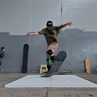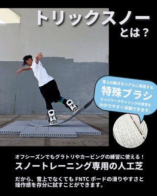 スノートレーニング専用人工芝「トリックスノー」を使用。特殊ブラシによりエッジワークやトリックの感覚を分かりやすく体験可能。オフシーズンでもグラトリやカービングの練習に最適です。