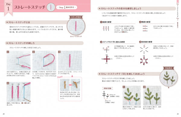 紹介するのは、よく使われる9つの基本ステッチ。それぞれに3つのステップを用意しています。