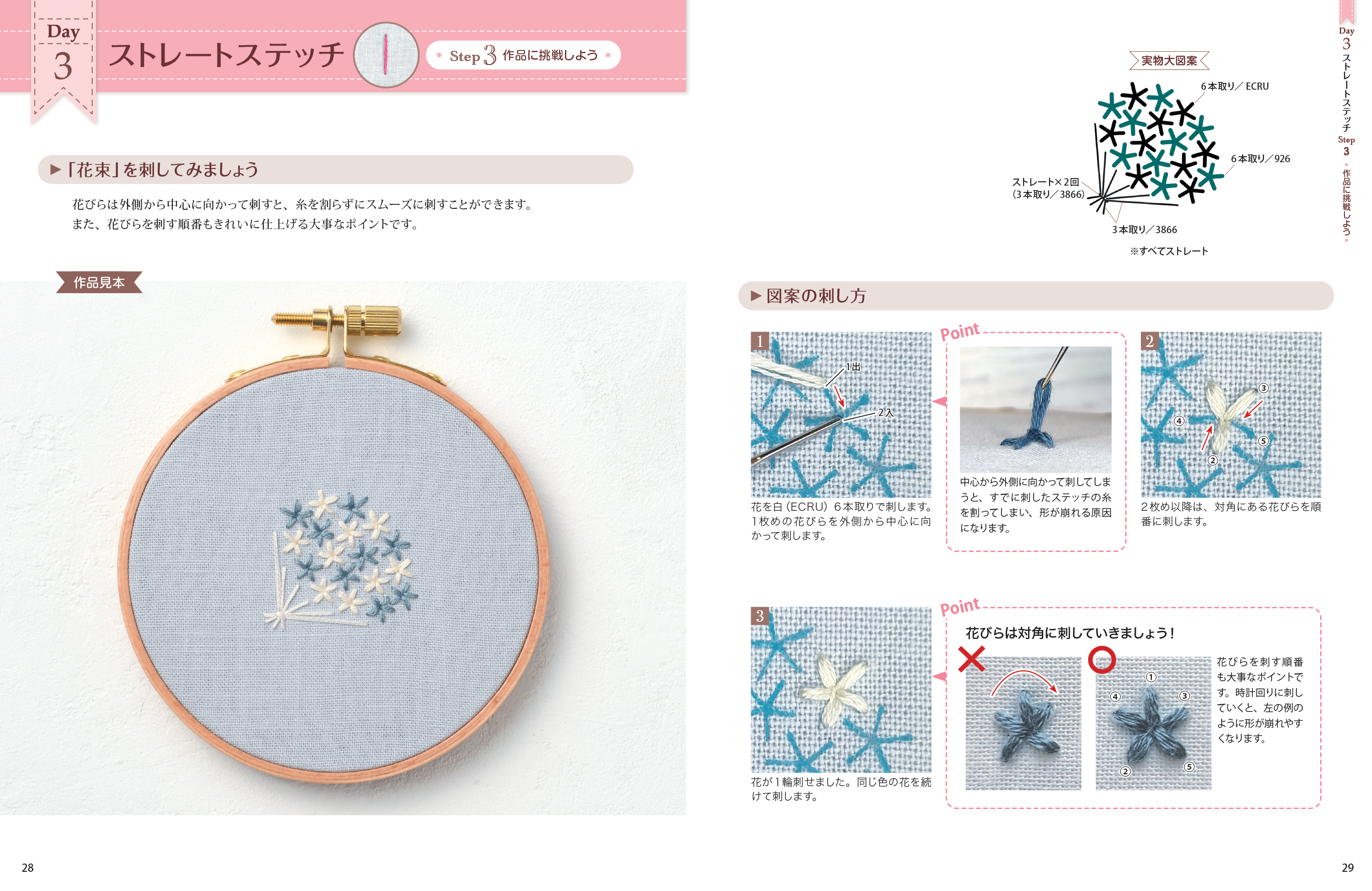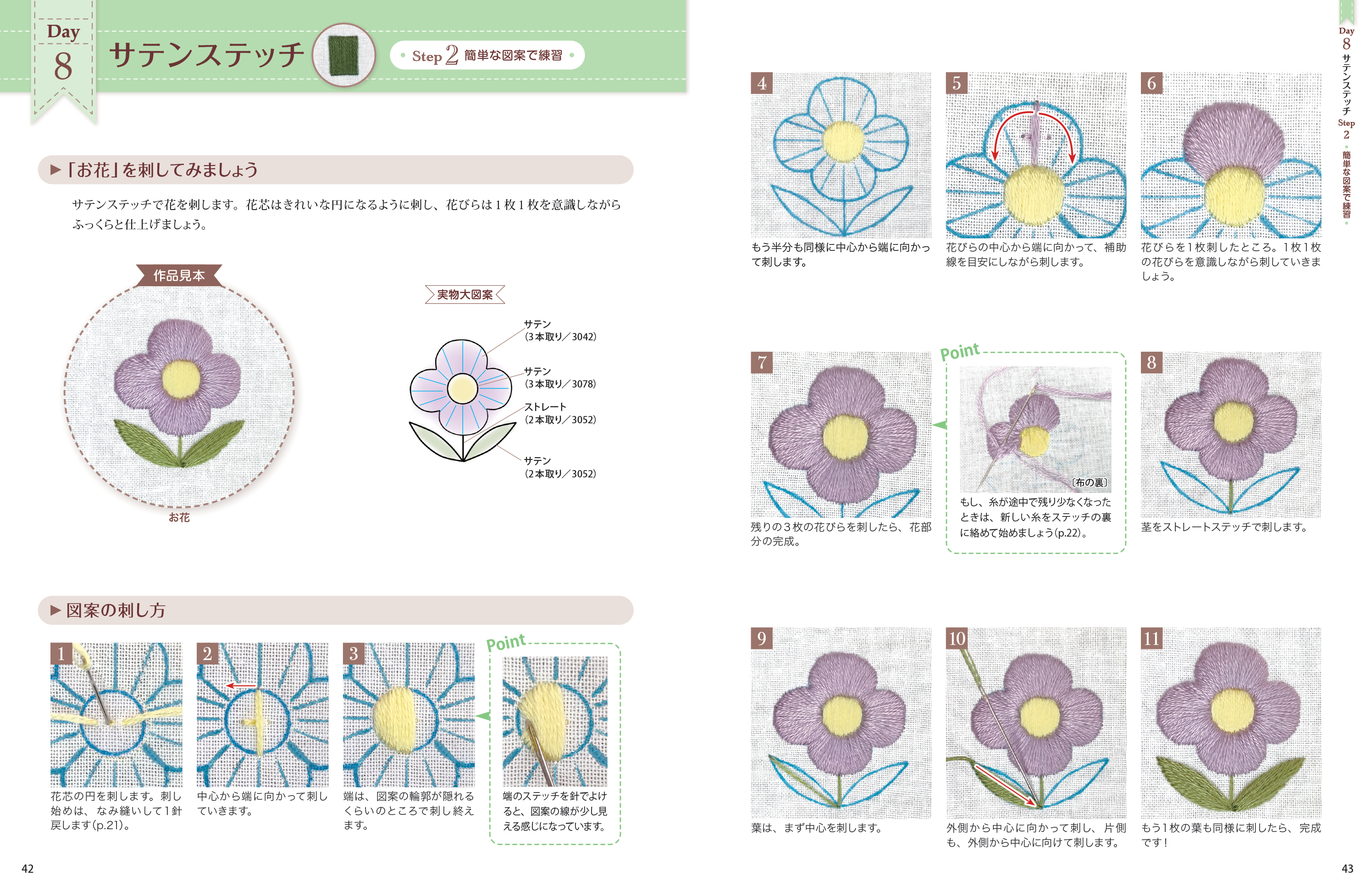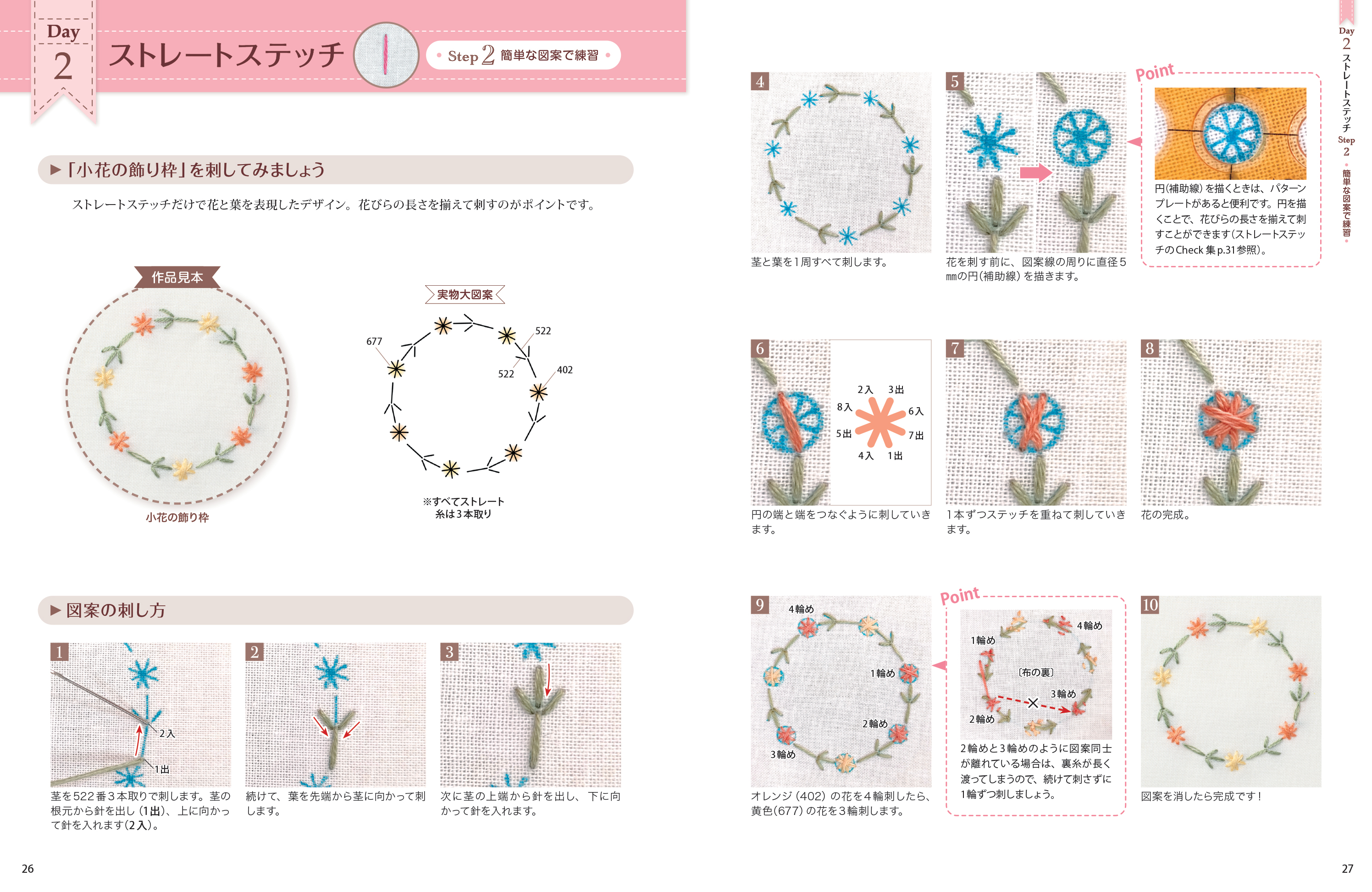 本書は、まるで誰かに教わっているような感覚で、刺繍の基本を1日1ステップ・全30レッスンで学べる初心者向けの入門書です。