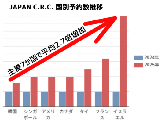 同シーズンにおいて、国別に見ると、特にイスラエルからのお客様が前年同期比で6倍と飛躍的に増加したほか、フランス(3.2倍)、タイ(2.5倍)、シンガポール、アメリカ、カナダが(2倍)、(韓国が1.6倍)など、欧米豪からアジアまで幅広い国と地域で予約数を大きく伸ばしています。この結果は、当社のインバウンド戦略が着実に成果を上げていることを示しています。