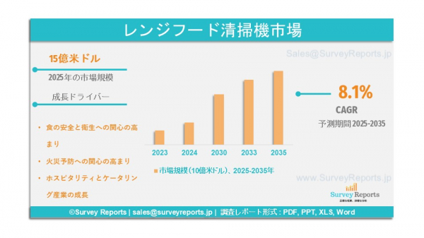 Survey Reports LLCは2025年9月に、「フード洗浄機市場:種類別(高圧洗浄機、スチームクリーナー、フォーム洗浄機、超音波洗浄機、手動高圧洗浄ツール)、電源別(電動機、ガス駆動機、バッテリー駆動機)、用途別(業務用厨房、産業用厨房、食品加工施設、レストランチェーン、クイックサービスレストラン(QSR))―世界市場分析、動向、機会および予測(2025年~2035年)」と題する調査報告書を発表した。この報告書はフード洗浄機市場の予測評価を提供している。また、成長要因、市場機会、課題、脅威など、フード洗浄機市場におけるいくつかの主要な市場力学を強調している。