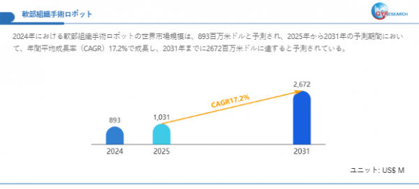 本調査では、2031年に世界の軟部組織手術ロボット市場が約2672百万米ドルに達すると予測しています。この成長は、2025年から2031年にかけて年平均成長率(CAGR)17.2%で進むと見込まれており、2024年の市場規模は約893百万米ドル、2025年には1031百万米ドルに達する見通しです。
