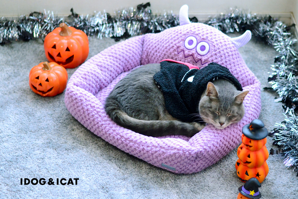 キョトンとしたお顔がついたペット用ベッドで、ハロウィンの撮影用小道具としても活用できちゃいます。