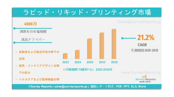 Surveyreportsの専門家による分析によれば、ラピッドリキッドプリンティング市場規模は2025年に4,580万米ドルを創出した。また、2035年末までに1億8,190万米ドルに達すると予測されている。予測期間である2025年から2035年にかけて、市場は**約21.2%の年平均成長率(CAGR)**で拡大する見通しである。