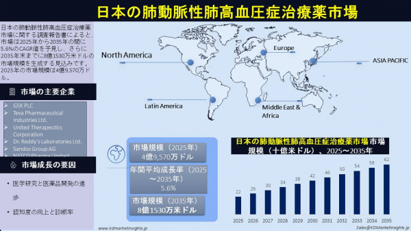 KD Market Insightsは、『日本における肺動脈性肺高血圧症(PAH)治療市場の将来動向と機会分析 - 2025年から2035年』と題した市場調査レポートを発表できることを嬉しく思います。本レポートの範囲には、現在の市場動向や将来の成長機会に関する情報が含まれており、読者が十分な情報に基づいたビジネス上の意思決定を行うことができます。本調査レポートでは、KD Market Insightsの研究者が一次および二次の調査分析手法を用いて、市場競争の評価、競合他社とのベンチマーク、そして彼らの市場参入(GTM)戦略の理解を行いました。