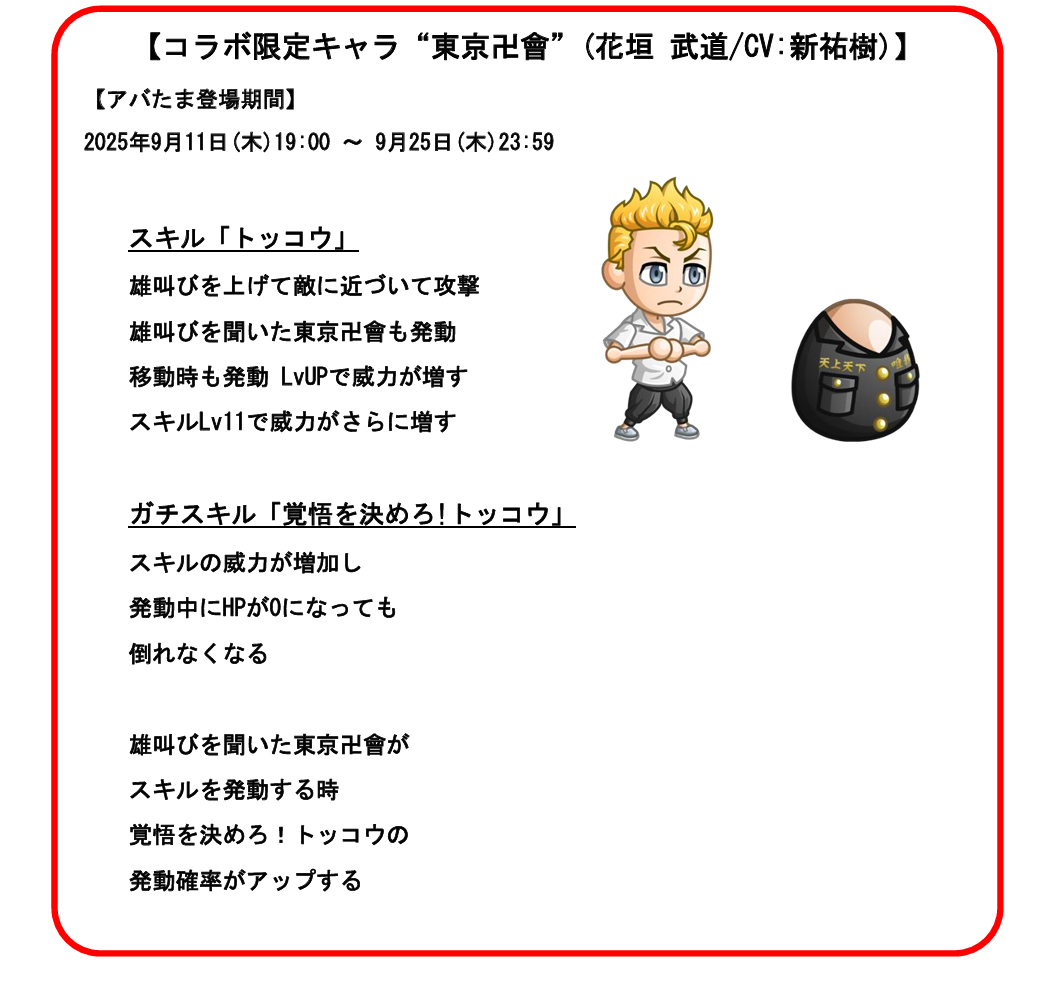 「東リベのアバたま」に限定キャラ「東京卍會」が再登場!「東京卍會」は初回当選でキャラタマゴとして「花垣武道(CV:新祐樹)」が入手できます。以降、当選回数に応じて「場地圭介(CV:水中雅章)」「三ツ谷隆(CV:松岡禎丞)」「松野千冬(CV:狩野翔)」「龍宮寺堅(CV:福西勝也)」「佐野万次郎(CV:林勇)」「紫八戒(CV:畠中祐)」といった東京卍會メンバーのお着替えなどが手に入ります。そして今回新たに「佐野万次郎(現代)(CV:林勇)」がアバたまに追加されます。なお「東京卍會」には今回、ガチスキルも実装されます。