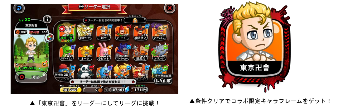 コラボ限定キャラ「東京卍會」をリーダーにしてリーグに挑む「リーダー腕利きGP」を開催いたします。バトルに勝利してより多くの「キャラフレP」を獲得したランキング上位者や条件を達成した方には、コラボ限定「キャラフレーム」が贈られます。なお、ランキング上位で獲得できるフレームは特別仕様となっており、重複して獲得することでフレームに星が追加されます。すでにフレームを獲得した方は星の獲得を目指しましょう!