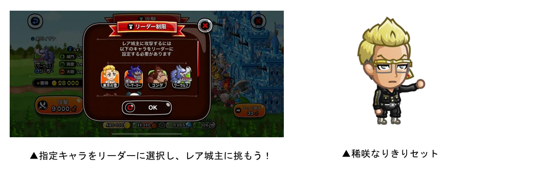 「バトル」から「ひとりで」または「みんなで」を選び、「攻撃」を選択すると、ランダムでレア城主が出現するレア城主イベントを開催いたします。条件をクリアすると剣士用限定お着替え「稀咲なりきりセット」がもらえます。