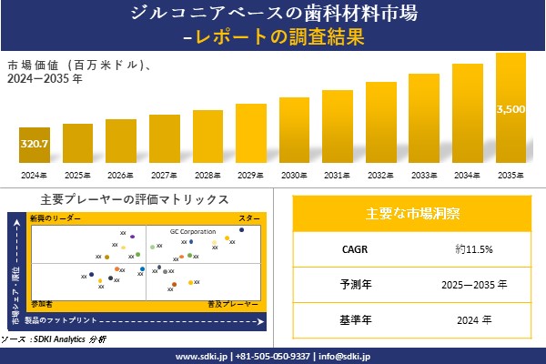 SDKI Analytics(本社:東京都渋谷区)は、このたび、2025年09月10に「ジルコニアベースの歯科材料市場調査レポート:2025-2035年の市場規模、シェア、傾向の予測」を発表しました。ジルコニアベースの歯科材料に関する市場調査レポートには、統計的及び分析的アプローチを使用した予測評価が含まれています。この調査レポートでは、一次及び二次調査方法を使用して分析された主要な業界洞察を通じて将来の傾向を理解できるようにすることで、主要な市場動向を読者に説明しています。