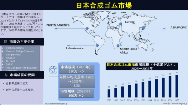 日本合成ゴム市場に関する調査レポートでは、市場は2025年から2035年にかけて3.5%のCAGR値を予測し、2035年末までに190万トンの市場規模を創出すると予測しています。2025年の市場規模は130万トン。