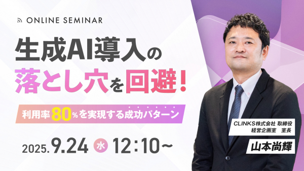 企業向け生成AIチャットツール「ナレフルチャット」を提供するCLINKS株式会社(本社:東京都中央区、代表取締役:河原浩介)は、生成AIの導入に取り組む企業向けオンラインセミナー「生成AI導入の落とし穴を回避!~利用率80%を実現する成功パターン~」を2025年9月24日(水)に開催いたします。