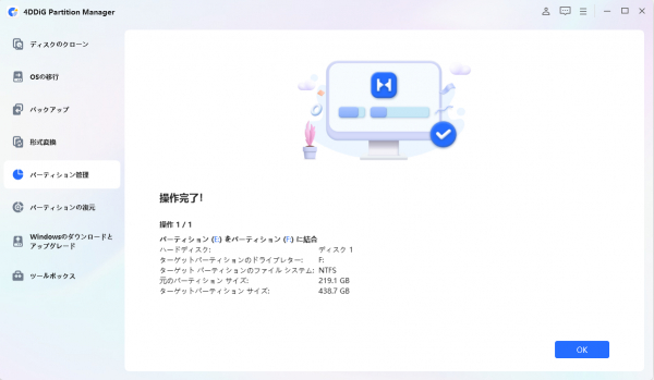 4.パーティションマージプロセスは、マージしたいパーティションのサイズによって、完了するまでに時間がかかることがあります。データの損失や破損を避けるため、プロセスが完了するまでプログラムを閉じないでください。パーティションが正常に結合されたら、「完了」をクリックします。
