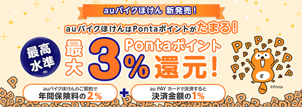 加入いただくと、業界最高水準(注)となる保険料の2%分(注)をPontaポイントで還元します。また、保険料をau PAY カードでお支払いいただくと、au PAY カードのご利用100円ごとにPontaポイントが1ポイント(還元率1%)たまります。保険料の2%還元とあわせて、合計で保険料の最大3%のPontaポイントがたまります。