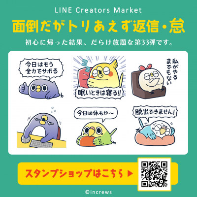 今後もLINEスタンプだけでなく、LINE着せかえやLINE絵文字に加え、「カワセル」及び「カワセルくじ」や「インクルーズプリント」でのフィジカルグッズ化など幅広く展開しますので、「面倒だがトリあえず返信」から生まれた株式会社インクルーズのオリジナルIPでもある「めんトリ」をトリあえず応援の程、宜しくお願い致します。
