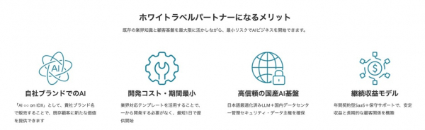 AIファクトリーは、これを ホワイトラベル形式で業界ごとにカスタマイズ提供 することで、パートナー企業や業界団体を通じたスピーディな普及を可能にします。
