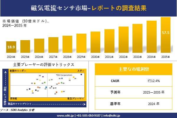 SDKI Analytics(本社:東京都渋谷区)は、このたび、2025年09月12に「磁気電流センサ市場調査レポート:2025-2035年の市場規模、シェア、傾向の予測」を発表しました。磁気電流センサに関する市場調査レポートには、統計的及び分析的アプローチを使用した予測評価が含まれています。この調査レポートでは、一次及び二次調査方法を使用して分析された主要な業界洞察を通じて将来の傾向を理解できるようにすることで、主要な市場動向を読者に説明しています。