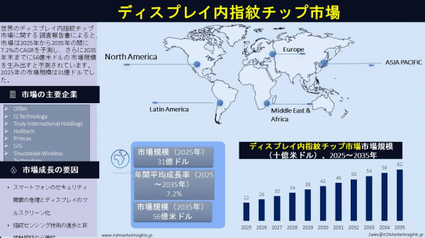 KD Market Insights は、市場調査サーベイレポート『ディスプレイ内指紋認証チップ市場の将来動向と機会分析 - 2025~2035年』を発表しました。本レポートの範囲には、現在の市場動向や将来の成長機会に関する情報が含まれており、読者が的確なビジネス判断を行えるよう支援します。本調査レポートにおいて、KD Market Insights のリサーチャーは一次・二次調査の分析手法を用い、市場競争の評価、競合他社のベンチマーキング、そしてゴー・トゥ・マーケット(GTM)戦略の理解を行っています。