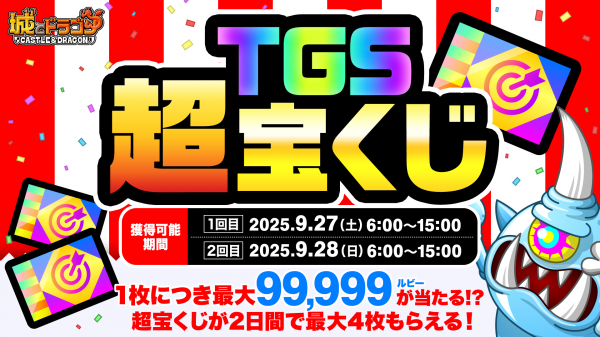9月27日(土)・28日(日)のTGS一般公開日限定で「超宝くじミッション(土曜・日曜)」が登場!会場に来場できない方でも、ミッションをクリアすることで「超宝くじ」最大2枚や最大800ルビー(2日間合計)がゲットできます。