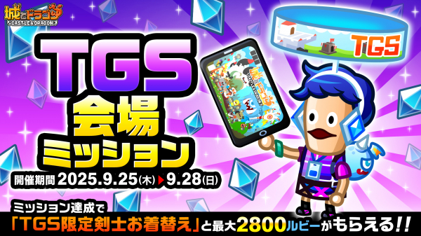 9月19日(金)6:00から、TGS開催1日目である9月25日(木)23:59までの7日間開催されますミッション内容は、期間中に「ログインする」だけ!1日目は100ルビー、2日目は150ルビーと日を追うごとにもらえるルビーが増加し、毎日ログインすれば総計3,000ルビーが獲得できます。
