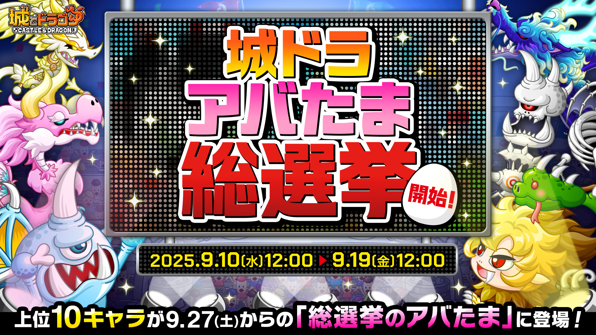 9月10日(水) ~ 9月19日(金)開催の「城ドラアバたま総選挙」で選ばれた10キャラのキャラタマゴや激レアお着替えがラインナップに加わった「総選挙のアバたま」が、9月27日(土)の結果発表後に登場!キャラやお着替えのほかにも、きびだんごウラPが排出される豪華なアバたまとなっています。