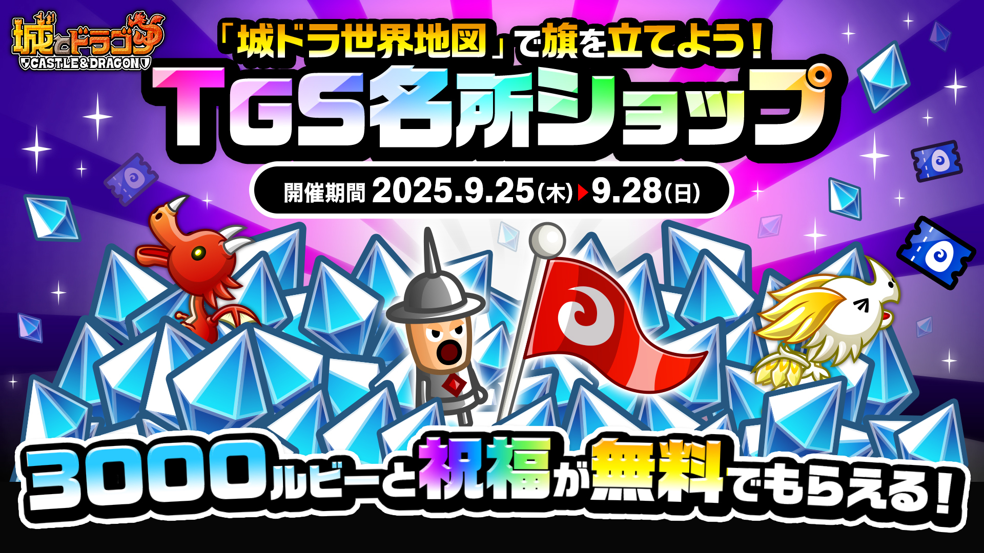 ゲーム内でGPS機能を利用した「城ドラ世界地図」機能でTGS会場近辺に旗を立てると、「TGS名所ショップ」が一定時間出現!3,000ルビーとTGSの祝福が無料で獲得できます。