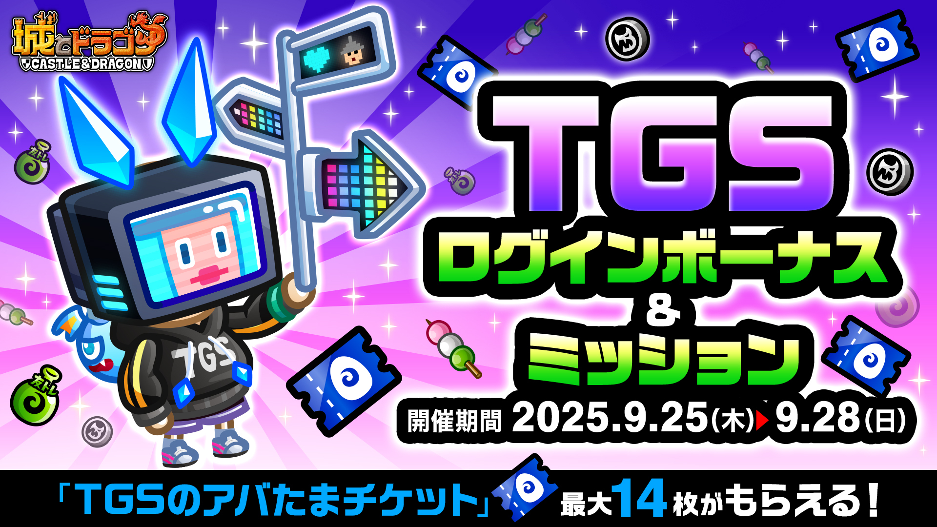 9月25日(木)からの4日間、『城とドラゴン』ゲーム内にて開催!TGS会場に行かなくても達成でき、「TGSのアバたまチケット」がログインボーナスとミッションで合わせて最大14枚獲得できます。
