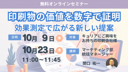 CEO:樋口 清政)は、2025年10月9日(木)/10月23日(木) AM11:00から、印刷業界向けに、【印刷物の価値を数字で証明】効果測定で広がる新しい提案 と題して、セミナーを開催することをお知らせいたします。