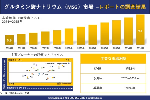 SDKI Analytics(本社:東京都渋谷区)は、このたび、2025年09月16に「グルタミン酸ナトリウム (MSG)市場調査レポート:2025-2035年の市場規模、シェア、傾向の予測」を発表しました。グルタミン酸ナトリウム (MSG)に関する市場調査レポートには、統計的及び分析的アプローチを使用した予測評価が含まれています。この調査レポートでは、一次及び二次調査方法を使用して分析された主要な業界洞察を通じて将来の傾向を理解できるようにすることで、主要な市場動向を読者に説明しています。