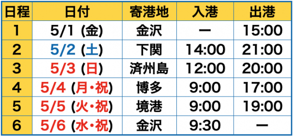 ゴールデンウィークに運航する2コースは、5/1発が5泊、5/6発が4泊と短いため、幅広い年代の方にお楽しみ頂けます。特にファミリーの方にもおすすめです。