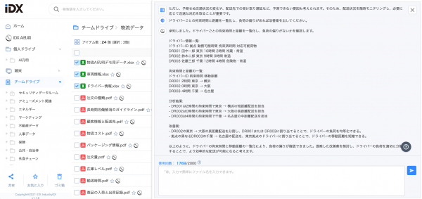 IDX上のナレッジチームドライブにアップロードされた配送履歴、 出発遅延・渋滞、 積載率、 拘束時間、 車両別KPIなどの非構造化データもRAG基盤で生成AIに活用。